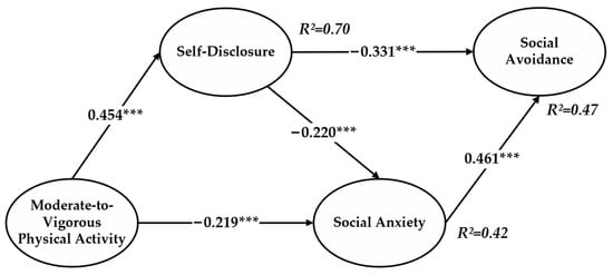 The structural path model in Figure 2 revealed a significant positive correlation between moderate-to-vigorous physical activity and self-disclosure (β = 0.454, p < 0.001), supporting H1; a significant negative correlation between moderate-to-vigorous physical activity and social anxiety (β = −0.219, p < 0.001), supporting H2; a significant negative correlation between self-disclosure and social anxiety (β = −0.220, p < 0.001), supporting H3; a significant negative correlation between self-disclosure and social avoidance (β = −0.331, p < 0.001), supporting H4; and a significant positive correlation between social anxiety and social avoidance (β = 0.461, p < 0.001), supporting H5.