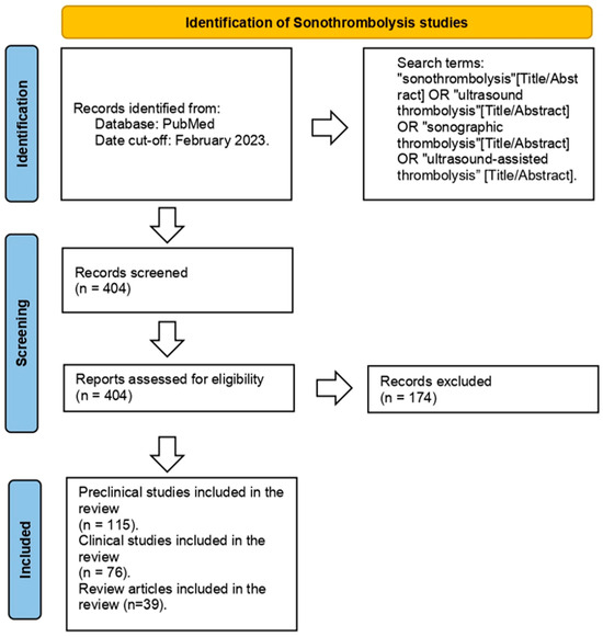 For this review paper, we conducted a Pubmed literature search to obtain clinical and preclinical studies that detailed the use and applications of sonothrombolysis, only including articles published before February 2023. The following search terms were employed: “sonothrombolysis” (Title/Abstract) OR “ultrasound thrombolysis” (Title/Abstract) OR “sonographic thrombolysis” (Title/Abstract) OR “ultrasound-assisted thrombolysis” (Title/Abstract).