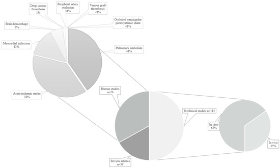 Animal models have been crucial in understanding the role of sonothrombolysis in different conditions, particularly ischemic stroke, thrombosis, and cardiovascular conditions, which can be applicable to both adult and pediatric populations. Researchers have utilized different animal species, including mice, rats, rabbits, pigs, and nonhuman primates, to investigate the use of this technique in the aforementioned pathological conditions. We found 46 animal studies, from which 14 evaluated intracranial thrombosis [3,20,21,22,23,54,55,56,57,58,59,60,61,62], 24 extracranial thrombosis [57,63,64,65,66,67,68,69,70,71,72,73,74,75,76,77,78,79,80,81,82,83], and 8 other vascular and cardiovascular conditions [84,85,86,87,88,89,90,91].