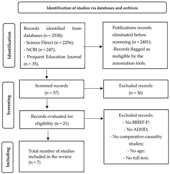 This systematic search and meta-analysis was registered in the Prospero platform under the registration number CRD42023465855. Articles in Spanish and English published in the databases Science Direct, NCBI (PubMed), and ProQuest Education Journals were reviewed. The articles had to be published between 2013 and 2023. In the databases, the search was restricted to “all article” and “journal article” in psychology, health, and education journals. The keywords were Attention Deficit Hyperactivity Disorder or ADHD or ADHD; Behavior Rating Instrument of Executive Function—School or BRIEF-P.