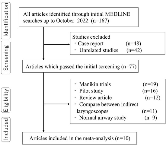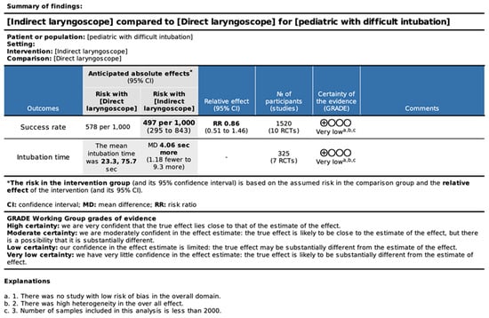 - Hoshijima, H.; Mihara, T.; Kokubu, S.; Takeda, S.; Shiga, T.; Mizuta, K. Effectiveness of Indirect and Direct Laryngoscopes in Pediatric Patients: A Systematic Review and Network Meta-Analysis. Children 2022, 9, 1280. [Google Scholar] [CrossRef] [PubMed]
