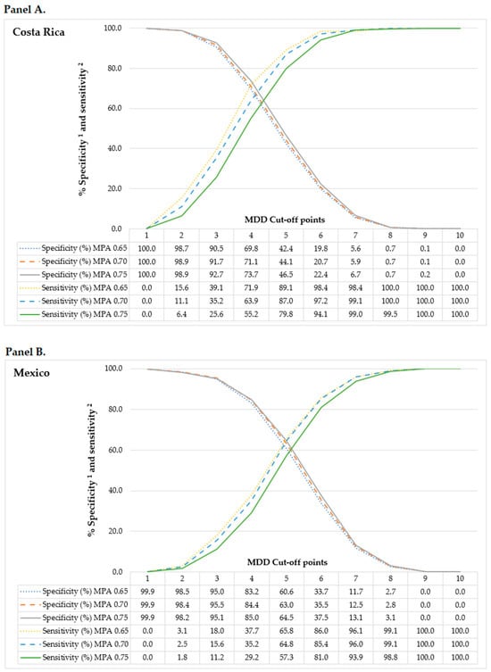 Percentage of specificity and sensitivity for diverse MPA values by 10 MDD cut-off points. (Panel A): CR adolescents, (Panel B): MX adolescents. 1 Specificity: identifies nutritionally appropriate diets as adequate. 2 Sensitivity: identifies nutritionally inappropriate diets as inadequate. MDD: Minimum Dietary Diversity; MPA: Mean Probability of Adequacy.