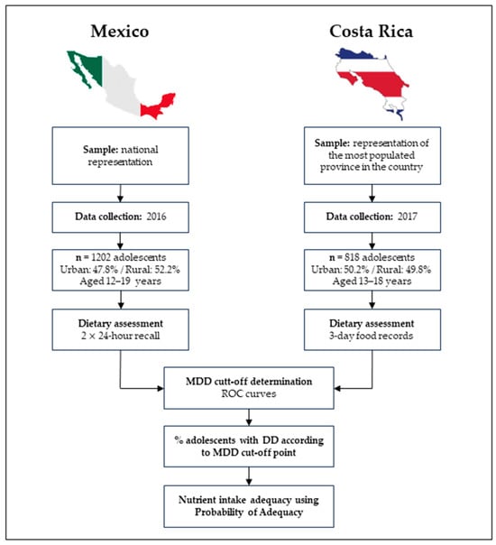 The aims of the current study were: (1) to determine the MDD cut-off point for the Costa Rican (CR) and Mexican (MX) adolescents’ diets, (2) to compare dietary diversity between CR and MX adolescents, and (3) to compare the micronutrient probability of adequacy in CR and MX adolescents.