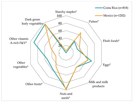 Percentage of Costa Rican and Mexican adolescents with consumption lower than 15 g for each of the ten food groups. F&V: fruits and vegetables. * Food groups with significant differences between countries (chi-square test, p < 0.05).