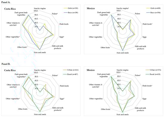 Figure 4 illustrates the distribution of adolescents who ingested less than 15 g/d of each food group across countries, categorized by sex (panel A) and area of residence (panel B). The percentage of Costa Rican adolescents consuming less than 15 g/d of pulses (43.1% vs. 29.2%; p < 0.0001) and eggs (74.0% vs. 67.4%; p = 0.044) was higher in girls; for other fruits (65.4% vs. 53.5%; p = 0.001) and other vegetables (58.1% vs. 50.8%; p = 0.044), the percentage was higher in boys. In Mexico, the percentage of adolescents consuming less than 15 g/d of flesh foods was higher in girls (40.6% vs. 34.0%; p = 0.018), and for starchy staples, it was higher in boys (6.9% vs. 4.1%; p = 0.034).