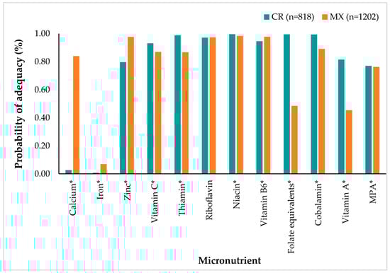 The calcium PA in CR adolescents was critically lower than in MXs (CR: 0.03 vs. MX: 0.84; p < 0.0001), while low PA was obtained for iron in both countries (CR: 0.01 vs. MX: 0.07; p < 0.0001). Also, the folate equivalents and vitamin A PA were notoriously low in MX adolescents, which was significantly lower than in CR (folate equivalents: CR: 0.99 vs. MX: 0.49; p < 0.0001; vitamin A: CR: 0.82 vs. MX: 0.45); p < 0.0001).
