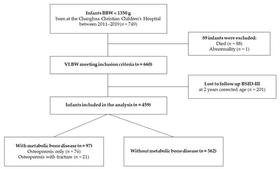 APA StyleChen, Y.-W., Chang, Y.-J., Chen, L.-J., Lee, C.-H., Hsiao, C.-C., Chen, J.-Y., & Chen, H.-N. (2024). Neurodevelopment Outcomes in Very-Low-Birth-Weight Infants with Metabolic Bone Disease at 2 Years of Age. Children, 11(1), 76. https://doi.org/10.3390/children11010076