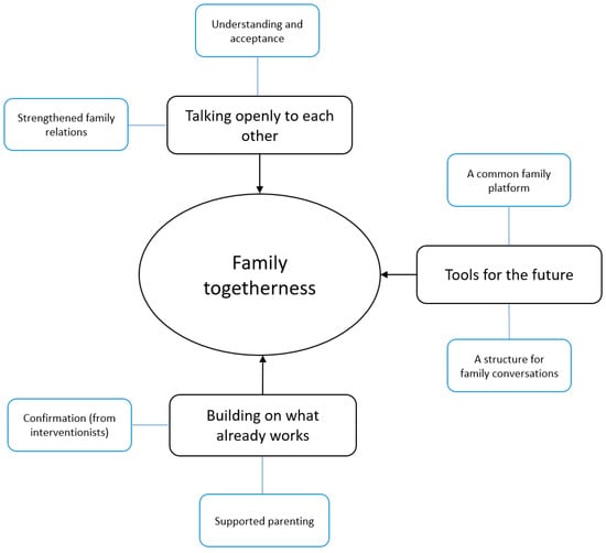 Following the intervention, parents expressed a greater acceptance and understanding of each other’s different perspectives, wishes, and needs. Talking more openly about feelings and thoughts within the family had, according to the parents, contributed to strengthened relationships between individual family members. Further, some of the parents stated that the improved family relations affected the family dynamics positively and that they felt more satisfied with family life in general. Some parents reported that they now spend more time as a family and do everyday activities together more often compared to before FTI.