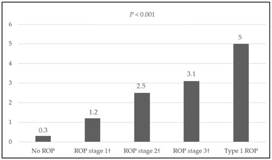 Stage and severity of ROP in function of the mean number of RBC transfusions. † Patients who do not meet the criteria for Type 1 ROP. P, Chi-square test.