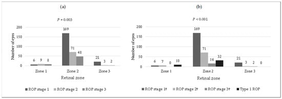 Retinal zone distribution of the different stages of ROP: (a) regardless of the need for treatment; (b) considering the need for treatment (type 1 ROP). † Patients who do not meet the criteria for Type 1 ROP. P, Chi-square test.