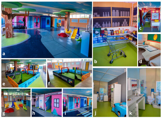 City of Tomorrow units. Image (a) shows the entrance hall of the City of Tomorrow. Images (b,c) illustrate the Market unit, where participants can engage in simulated shopping experiences. This unit is crucial for practicing daily living skills, enhancing cognitive functions, and promoting social interaction in a controlled and supportive environment. Image (d) presents part of the School unit, which replicates a classroom setting. This unit is essential for educational activities and cognitive rehabilitation, allowing participants to work on academic skills and social behaviors in a natural context. Images (e,f) show the Fitness Space unit, a space used to promote physical fitness. This unit supports the development of motor skills and encourages an active lifestyle. Images (g–i) provide external views of some units of the City of Tomorrow, highlighting the interconnectedness and accessibility of the different therapeutic spaces. These views emphasize the holistic approach of the environment, where various aspects of daily life are integrated into the rehabilitation process. Finally, images (j,k) illustrate the Home unit, a space designed to mimic a residential setting. This unit allows participants to practice essential daily tasks and self-care activities in a realistic yet controlled environment, fostering independence and confidence in their abilities.