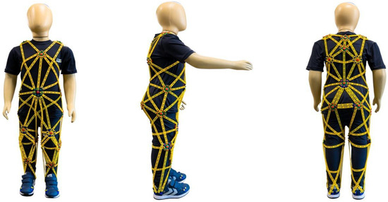 The TREINI Exoflex suit, illustrated in Figure 2 and Figure 3, is a therapeutic innovation made of lightweight, adjustable, and comfortable fabric (84% polyamide; 16% elastane). It incorporates interconnected viscoelastic strips made of a non-toxic silicone polymer, anchored at fixation points, or “nodes”, made of nylon. These strips form force-transmission pathways that distribute tension throughout the suit and, consequently, to the wearer. Made from flexible material, the TREINI Exoflex allows activities to be performed without mobility restriction, while providing effective therapeutic support. The assembly of the TREINI Exoflex is individualized, being adjusted according to the individual postural patterns of the wearer. Initially, a basic assembly is performed, from which adjustments are made to correct the different postural imbalances observed in participants. The initial adjustment of the strips is always performed gradually, respecting each child’s tolerance.