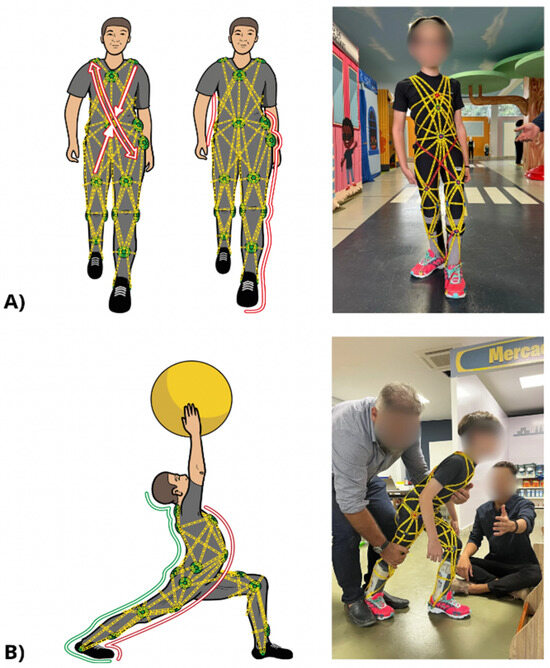 Myofascial meridians (lateral lines, spiral line, functional lines, superficial back line, and superficial front line) being stimulated by TREINI Exoflex during the execution of functional movements. This stimulation aims to allow muscles to work more efficiently, improving movement and coordination. (A) The lateral lines run along each side of the body. These lines provide balance between the front and back lines (see (B)), connecting torso and legs. They also limit excessive rotation and slow down the lateral oscillation of the body when walking. The spiral line and functional lines are also integrated in an alternating manner during walking. (B) The superficial back line is stimulated during body extension and the superficial front line is stretched. The energy stored through stretching is used to facilitate movements. From hyperextension onwards, all the pathways of the superficial front line are united.