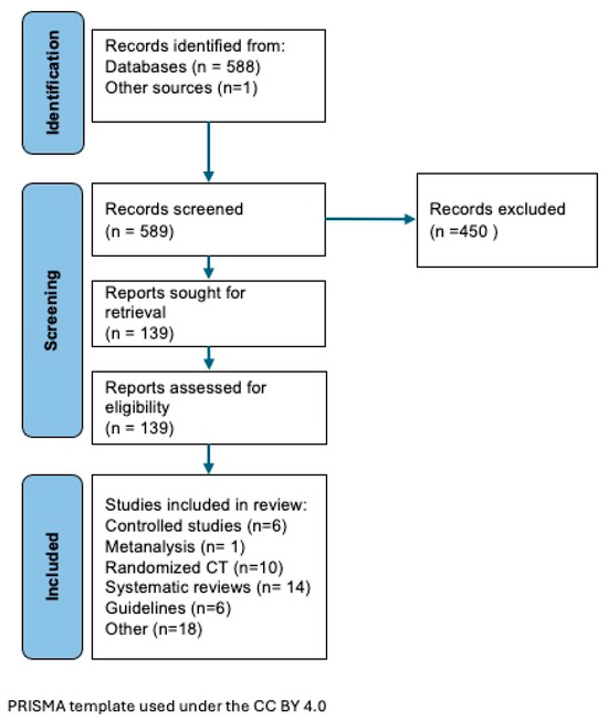 Out of an initial selection of 589 articles we considered 139 as possibly relevant and further reviewed them. A figure was created using the PRISMA recommendations (Figure 1) and is presented here to illustrate the type of published evidence that we finally considered for this article.