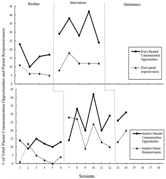 As seen in Figure 1, during baseline, Elsa had a mean of 16.5 for parent communication opportunities (range = 10–23). During the intervention phase, the mean increased to 32.2 (range = 24–42) for parent communication opportunities (see Figure 1). During baseline, Sandra had a mean of 12.2 for parent communication opportunities (range = 9–15). During the intervention phase, the mean increased to 26.33 (range = 14–33) for parent communication opportunities. During maintenance, at two weeks and four weeks post-intervention, the mean increased slightly to 28.5 (range = 26–31). The range and visual inspection of the data reveal that parents became stronger at providing communication opportunities as they had more exposure to the intervention and practice using the strategy.