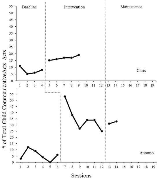 Figure 2 shows that during baseline, Chris had a mean of 7.5 communicative acts (range = 5–11). During the intervention phase, the mean increased to 16.8 (range = 15–19) communication acts. During baseline, Antonio had a mean of 5.7 communicative acts (range = 0–12). During the intervention phase, the mean increased to 35.2 (range = 25–53) communicative acts. During maintenance, the mean dropped slightly to 32 (range = 31–33). The types of communication varied for each participant (see 12).