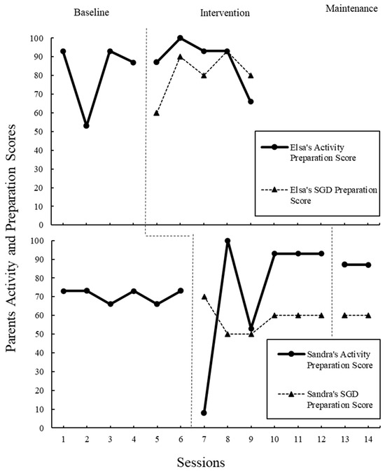 To answer the question of parent fidelity for using POWR, each element of the strategy was considered. For “P”, prepare the activity and the AAC device, parents were rated on preparing the activity and preparing the AAC device (see Table A1). These rating scales were adapted from Douglas’s original parent self-rating scale [3]. Intervention and maintenance scores were compared with the baseline (see Figure 3). Elsa received high scores for preparing the activity across all phases of the intervention. Additionally, Elsa was quick at learning to prepare the SGD during the intervention phase with an average score of 88% after taking the modules. Sandra showed improvement in preparing activities after taking the modules. Although she did not pick up the skill as quickly, her SGD preparation became stable at 60% at the end of the intervention phase.