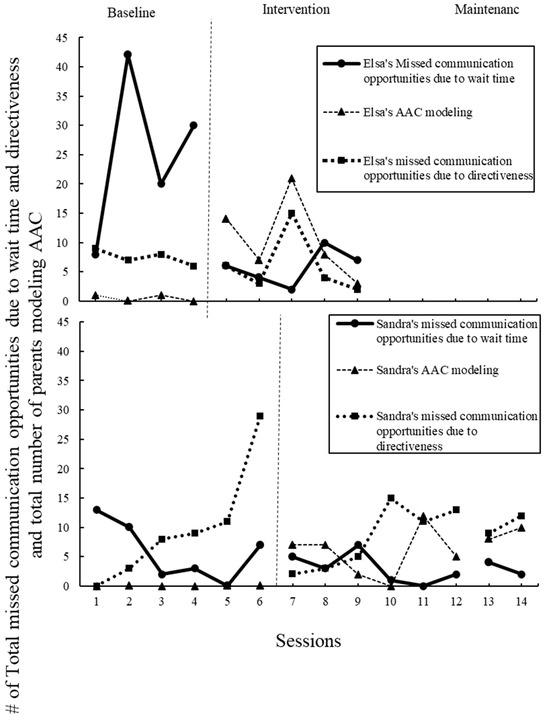 Step three, “W”, waiting for the child’s communication was investigated by counting the number of missed communication opportunities due to wait time. In the modules, parents were instructed to wait at least five full seconds after providing a communication opportunity to the child. Elsa’s missed communication opportunities decreased from an average of 20 at baseline to 6 during the intervention phase. Sandra’s missed opportunities due to waiting time were relatively low at baseline, with an average of 6, an average of 3 during intervention, and an average of 3 during maintenance.