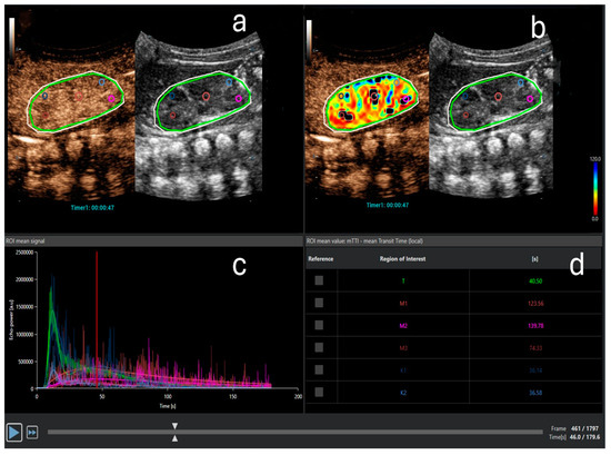 Contrast-enhanced ultrasound quantitative analysis. (a) Three regions of interest (ROIs) in the medulla (pink, purple, and red) and two ROIs in the cortex (light and dark blue) are designated. The light green oval ROI represents the entire kidney. The outer white ROI represents the area where analysis is performed. (b) Perfusion map for the parameter mean transit time (mTT) with selected ROIs. (c) Time-intensity curve (TIC): echo power in arbitrary units on the ordinate and time on the abscissa. Different curves represent the anatomical regions, marked with the same color as the ROIs in (a,b). Note the typical shape of the curve after bolus-contrast administration. (d) The quantitative analysis for mTT in seconds for the entire kidney (t), cortex (K1, K2), and medulla (M1–M3). mTT is the time to 50% of peak signal intensity and is prolonged in the medulla compared to the cortex due to the physiological renal perfusion, where the cortex receives most of the blood volume earlier than the medulla.