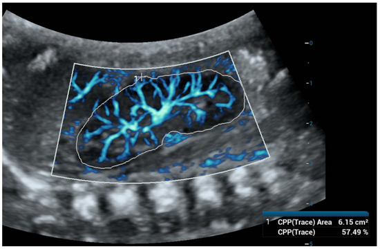 Ultra-microangiography (UMA) of a newborn’s right kidney using a convex abdominal probe. To calculate the Vascular Index (VI), we used the color pixel percentage (CPP)—trace function and outlined the outer borders of the kidney. The VI was 57.49%.