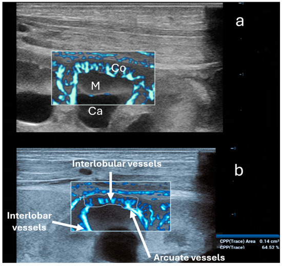 Ultra-microangiography (UMA) of the renal cortex (Co) and a medullary pyramid (M) in the same newborn using a linear 20 MHz probe. Ca—minor calyx. (a) Interlobar vessels traverse Bertin’s columns between two adjacent renal pyramids. Interlobar vessels branch into the arcuate vessels. The latter creates an arch above the medullary pyramids, giving off the interlobular vessels that radiate peripherally perpendicular toward the cortex. (b) Calculation of the vascular index solely of the cortex (64.52%) using the trace option (below).