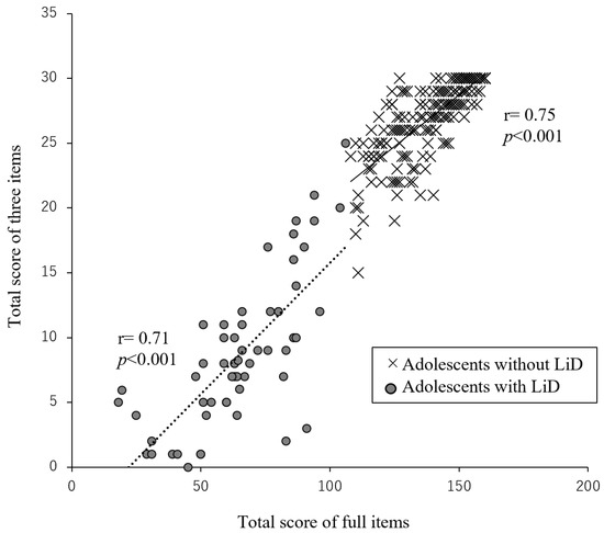 Figure 1 illustrates a correlation diagram between the aggregate scores of the three items and all items for adolescents with and without LiD. Significant correlations were noted between the total number of items (adolescents without LiD: r = 0.75, p < 0.001; adolescents with LiD: r = 0.71, p < 0.001). The correlation coefficients for both groups were also significant (r = 0.95, p < 0.001). These results indicated that the short questionnaire was effective in screening for LiD.