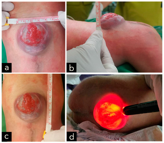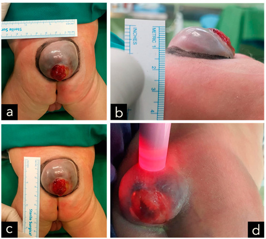 (a–c) A cystic MMC at the lumbosacral region, with skin erosion at the surface of the lesion, measuring 4 × 3 × 1 cm in size and associated with cerebrospinal fluid leakage. (d) Positive transillumination result.