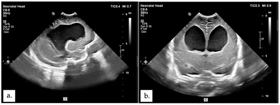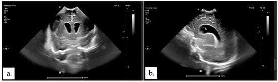 Post-surgical head ultrasound showing ventriculomegaly. (a) axial plane. (b) sagittal plane.