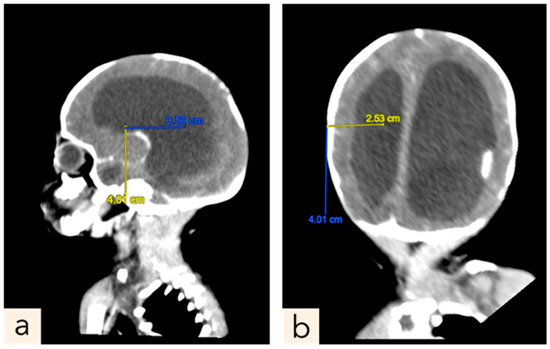 The patient encountered multiple complications following the surgical procedure. On the eight days postoperative, bilateral leg weakness was observed, persisting until discharge. Concurrently, periorbital edema and hypoalbuminemia (2.2) were identified through clinical examination and blood tests, respectively. After 7 days of treatment with ampicillin and gentamicin, the antibiotic regimen was continued with cefotaxime and amikacin for 14 days, followed by ceftazidime for the remaining 13 days. On the nineteenth postoperative day, a TORCH screening was conducted, resulting in a diagnosis of Rubella. By the twenty-first postoperative day, a decrease in hemoglobin levels was noted (9.3), suspected to be attributable to an infectious process. During this period, the patient also presented with wound dehiscence. On the same day, the patient experienced respiratory distress which improved with the administration of oxygen via binasal canula. Therefore an orogastric tube (OGT) was placed to assist with feeding. There were no signs of increased intracranial pressure after surgery and the lumbar CSF culture obtained during surgery showed no microbial growth. The patient was released home at 33 days old and 31 days post-operative closure defect—with orogastric tube (OGT) due to feeding problem, and the surgical scar remained clean with minimal wound dehiscence. The parents were educated on how to monitor their child’s overall condition and measure head circumference daily at home. Fifteen days later, the patient was readmitted at 48 days old (POD 46) due to experiencing six episodes of seizures at home and the mother reporting a rapid increase in the child’s head circumference (birth: 30 cm, POD 1: 30.7 cm, POD 31: 33.1, POD 46: 37.1). An USG (Figure 6) and CT scan (Figure 7) was performed, revealing obstructive hydrocephalus. At 53 days old (POD 51), the patient underwent a Ventriculoperitoneal shunt (VP shunt) procedure. The patient later planned to have a follow-up at the Neurosurgery polyclinic, Neonatology polyclinic and the Pediatric Infections Diseases polyclinic at Hasan Sadikin General Hospital Bandung.