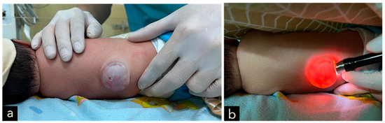 (a) A cystic MMC at the thoracic region, with a hole accompanied by CSF leakage on the upper part of the lesion, measuring 3.5 × 3.5 × 1.5 cm in size and associated with cerebrospinal fluid leakage. (b) Positive transillumination result.