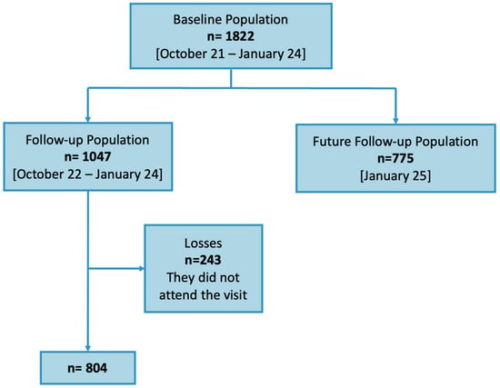 The initial population sample contained 1822 children from 16 primary schools in the city of Terrassa. The initial exam data were collected between October 2021 and January 2024. After one year, the 1047 children visited by January 2023 were invited to a follow-up visit between October 2022 and January 2024. A total of 804 attended. The age range of the children was between 8 and 10 years. The remaining 775 children will be evaluated in the next phase of this study (Figure 1).