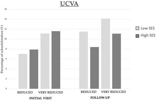 Secondly, an evaluation of the findings was carried out during the one-year follow-up. Children from low-SES families had higher rates of reduced and very reduced UCVA (proxy of myopia) compared with children from high-SES families. The prevalence of very reduced UCVA increased to 14.1% in children with a low SES compared with 11.1% in children with a high SES (p = 0.001). This means there was an increasing incidence of refractive errors for low-SES children.