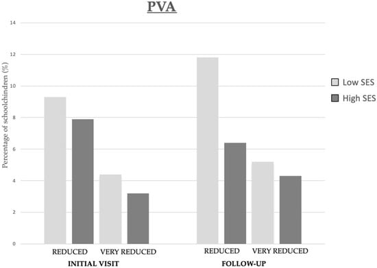 Gender differences were not found in either the low- or high-SES groups at the first visit (χ2; p = 0.855 for males and p = 0.388 for females). In contrast, significant differences were observed in females during the follow-up (χ2; p = 0.01). More female students had reduced PVA (15.6%) in the low-SES group than in the high-SES group (6.8%), but no differences were found in the male gender (χ2; p = 0.633).
