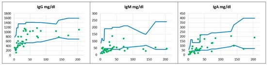 The distribution of serum immunoglobulins G, M, and A in the children studied. The immunoglobulin concentrations expressed in mg/dL in relation to the patients’ ages given in months and to age-matched reference values. Reference minimal and maximal values