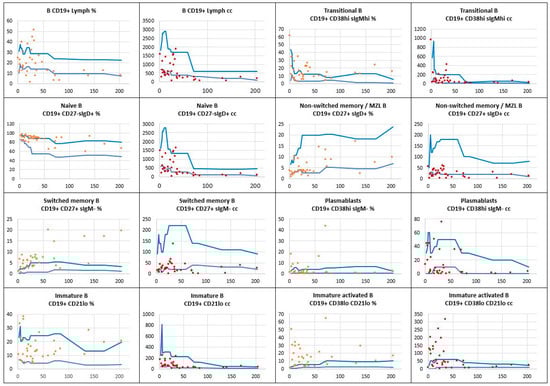 - CD19+ B cells, immature CD19+CD21lo, immature activated CD19+CD38loCD21lo, transitional CD19+CD38hisIgMhi, naïve CD19+CD27-sIgD+, non-switched memory CD19+CD27+sIgD+, switched memory CD19+CD27+IgD- B cells, and CD19+CD38hisIgM- plasmablasts