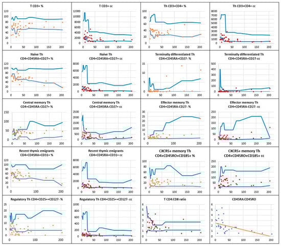 The relative counts (percentage of total lymphocytes) and absolute numbers of T CD4+ helper cell subpopulations in a group of children with Down syndrome in relation to age-matched values. The regression curve shows the naïve CD4+CD45RA+ to memory CD4+CD45RO+ T helper cell ratio. Reference minimal and maximal values