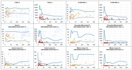 In Figure 3, the distribution of the total T CD3+ pool and T CD4+ helper cell subsets is displayed. Whereas the number of T CD3+ lymph cells was low in 12 children, the absolute counts of T CD4+ helper cells were below reference values in 14 children (40%). For recent thymic emigrants, both their relative counts and absolute numbers were low in 8 (23%) children. A substantial reduction in the production of naïve CD4+CD45RA+CD27+ T helper cells was seen in a significant number of the children studied, with low relative and absolute counts in 18 (51%) and 17 (49%) of them, respectively.