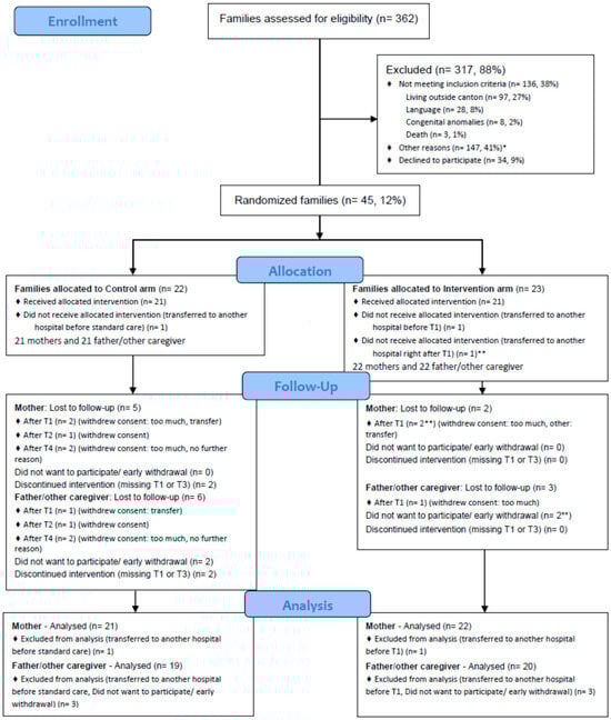 CONSORT Flow diagram [28]. * transferred to another hospital during the recruiting process (n = 97, 27%), discharge during the recruiting process (n = 3, 1%), recruiting stop (n = 20, 6%), completeness of gestational group (n = 15, 4%), parental non-decision (n = 4, 1%), mother or children very sick (n = 7, 2%), parental non-compliance (n = 1, 0.3%). ** includes family transferred to another hospital after T1.
