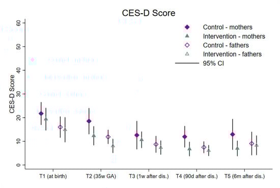 For continuous outcomes, the adjusted mean difference between the intervention group (IG) and control group (CG) and its 95%-CI were computed through repeated-measures mixed-effects linear regression models. Adjustment was carried out for stratification factors used in randomization (multiple births and preterm group) with a random intercept for subjects to account for the correlation of outcome data between multiple timepoints. An interaction term between the randomization group and time was also considered. If baseline data were available (CES-D, STAI, PTSD, PSI-SF and TOPSE), the model was adjusted for the baseline value. Crude means and their 95%-CI were also computed by group and timepoint. The adjusted mean difference for study burden was computed with ordinary linear regression because it was only measured at one timepoint (T5, 6 months after discharge). Mothers and fathers were analysed separately. The woman as the other caregiver was considered with mothers. For this family with two mothers, cluster-robust standard errors for families were included. A negative difference represents a lower score in the IGs compared to the CGs and vice versa. These model-based analyses were carried out based on the Full Analysis Set (FAS) of participants. Scores’ means and their 95%-CI were computed and represented in graphs by visit and randomization group separately for mothers and fathers.