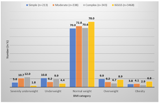 In order to allow for a comparison of the BMI data for all age groups, BMI percentiles were used and were categorized as severely underweight, underweight, normal weight, overweight, and obese according to the definitions of Kromeyer-Hauschild et al. [24,25] (Table 4).