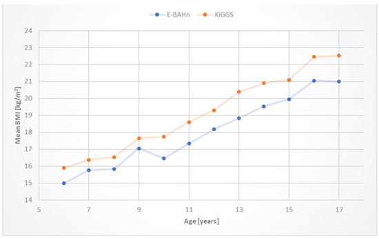 Age-related mean body mass index (BMI) of children with congenital heart defects (CHDs) (E-BAHn; n = 894) and healthy reference group (KiGGS; n = 3468). Children with CHDs showed significantly lower BMI (p < 0.001).