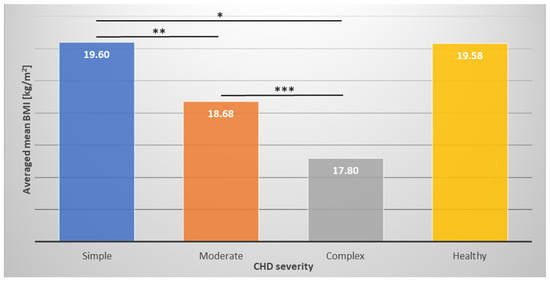 Consequently, compared with their healthy peers, children with CHDs showed a significantly lower body mass index (BMI) (p < 0.001), while the difference in BMI appeared most pronounced in older children (Figure 2). When we compared the averaged mean BMI between the CHD severity classes, there was no difference between simple CHD and the healthy reference group; however, there was a significant difference between simple and moderate (p = 0.005), simple and complex (p < 0.001), and moderate and complex CHDs (p = 0.002), while patients with complex CHDs had the lowest BMI (Figure 3).