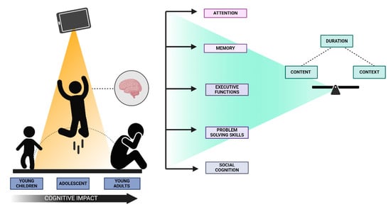 The dual-edged nature of technology’s impact is particularly evident when examining its influence on cognitive domains such as attention, memory, executive functions, and social cognition. On the one hand, interactive digital experiences, including video games, have been associated with enhancements in visual-spatial abilities and cognitive flexibility. Educational apps offer promise in fostering problem-solving skills and logical reasoning [,]. On the other hand, prolonged screen time has been correlated with attentional deficits, reduced academic performance, and weakened social interaction abilities [,]. These conflicting findings emphasize the need for a balanced, context-dependent investigation of how digital devices might foster or hinder cognitive development [].