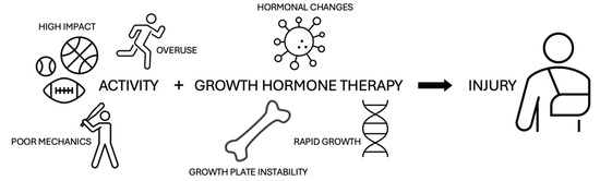 The pathogenesis of GHT and its interaction with developmental disorders in adolescents is similar to that of its mechanism in osteonecrotic disorders. GH, and its harmonious relationship with IGF-1 and androgen hormones, is crucial for appropriate growth. Notably, diseases like scoliosis, which has been shown to worsen during natural stages of development characterized by increased growth, are at greater risk, as GH further accelerates growth [16]. A combination of environmental and biological factors influences the incidence of injury in pediatric patients taking GHT, especially in those who have pre-existing conditions and in those who are athletes (Figure 1).