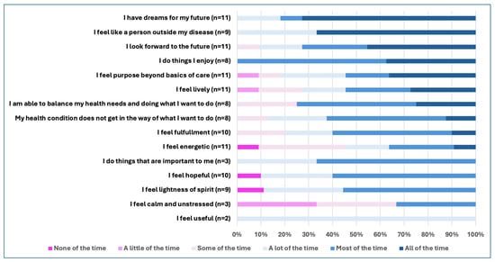 The hopefulness ratings for the 15 questions assessed ranged from 1 to 6 (median 5) on the six-point scale, where 1 = none of the time, and 6 = all of the time (Figure 2). All of the young people (n = 11) reported that they do things they enjoy, either all of the time or most of the time. Between 70 and 80% of the young people who received the items also responded that they all of the time or most of the time have dreams for their future, are able to balance their health needs with the things they want to do, and look forward to the future. In contrast, just over half of the young people felt lively and that they had purpose beyond the basics of care. Only 36% felt energetic all or most of the time.
