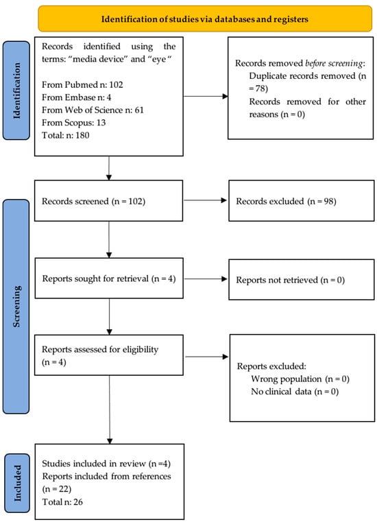 A review of the literature was performed according to the PRISMA guidelines [] on 30 May 2024. An electronic search was undertaken, first using the PubMed database, searching for “media device” and “eye” with the filter “age 0–18”, article language “English”, and publication date of the last ten years. Then, we investigated other database sets, namely Embase, Web of Science, and Scopus. On Embase we used the search terms “media device” AND “eye”, from 2014 to 2024; on Web of Science, the topics “media device” and “eye” were refined by publication years from 2014 to 2024, and limited to infant or child preschool or child or adolescent; and on Scopus, the keywords “media device” and “eye” were limited to adolescent or child or infant, with publication date from 2014 to 2024.