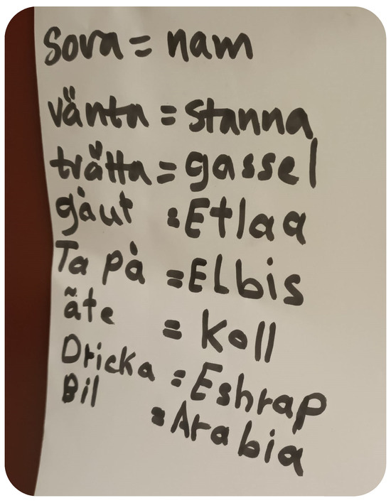 A note left by preschool teachers to remind the children of their mother tongues. In the figure, several Swedish words are paired with their Arabic equivalents to demonstrate bilingual vocabulary. For example, sova (to sleep) is translated as nam, while vänta (to wait) is matched with stanna. Similarly, tvätta (to wash) is paired with sassel, and gå ut (to go out) is translated as etlaa. The Swedish phrase ta på (to put on) corresponds to elbis, and äta (to eat) is rendered as koll. Additionally, dricka (to drink) is translated as sshrap, and bil (car) is shown as arabia. These translations illustrate a direct linguistic connection between the two languages, highlighting basic everyday vocabulary.