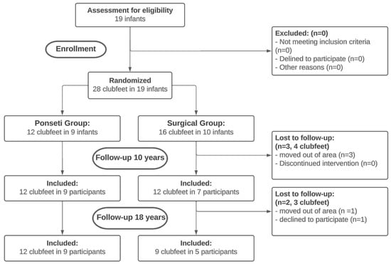 This is a single-center, randomized, controlled, non-blinded, prospective, long-term, intention-to-treat study designed to evaluate the long-term outcomes of clubfoot interventions. The primary outcome measure is the Functional Rating System (FRS), which was chosen to assess treatment efficacy [11]. This paper presents the results of the final long-term follow-up at the beginning of adulthood of patients with clubfoot who underwent treatment using either the Ponseti method or surgical intervention [12,13]. The presented follow-up was planned for 18 years after treatment onset. Ethical approval for this final follow-up was granted by the local institutional review board (IRB00002556, EK Nr. 24-221).