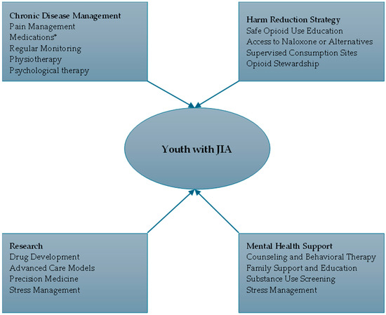 The integration of chronic disease management with harm reduction strategies for youth with JIA is a comprehensive strategy that addresses both medical and psychosocial needs, addressing the dual challenges of managing chronic pain and mitigating opioid-related risks [15].