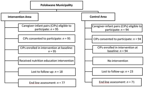 It was a quasi-experimental study design. Additionally, because data was gathered at two distinct reference points (baseline and end line), the study was longitudinal. The primary outcome of the present study was to evaluate the influence of a community-based complementary feeding education program on the nutritional status of infants aged 3 to 12 months. While the secondary outcome was to evaluate how effective the community based complementary feeding education interventions were on the nutritional status of the infant by measuring the change (baseline versus end line) in selected anthropometric measurements such as weight, length, mid upper arm circumference in the intervention group compared to the control group (Received no intervention). DIMAMO villages are located west of Polokwane, while Moletji is in the east. Simple random sampling by location was used to determine which area should serve as intervention or control. Moletji was assigned tail and DIMAMO as head. Tail and head represent the intervention and control groups, respectively. The coin was tossed, and caregiver-infant pairs in DIMAMO were enrolled as controls while Moletji served as the intervention group. A pretest–posttest control group design was used in the investigation. Prior to intervention, baseline data was gathered for both the control and intervention groups. After baseline, the control group did not receive complementary feeding education, while the intervention group did receive complementary feeding education. The intervention was carried out between September 2023 and February 2024. Following the intervention, data was gathered once more from both groups. Anthropometric nutritional status was reviewed following the six-month implementation of the intervention program. Polokwane municipality, in South Africa’s far north, is where this investigation was carried out. Approximately thirty percent of caregivers lived in rural villages governed by tribal authorities. The study design flow chart is shown in Figure 1, presented in the flow diagram is the recruitment process. These include the number of caregiver-infant pairs that were found to be eligible for the present study in both the intervention and control groups, the number of participants who consented to participate, those lost to follow-up, and those who managed to participate at both baseline and end line assessment.